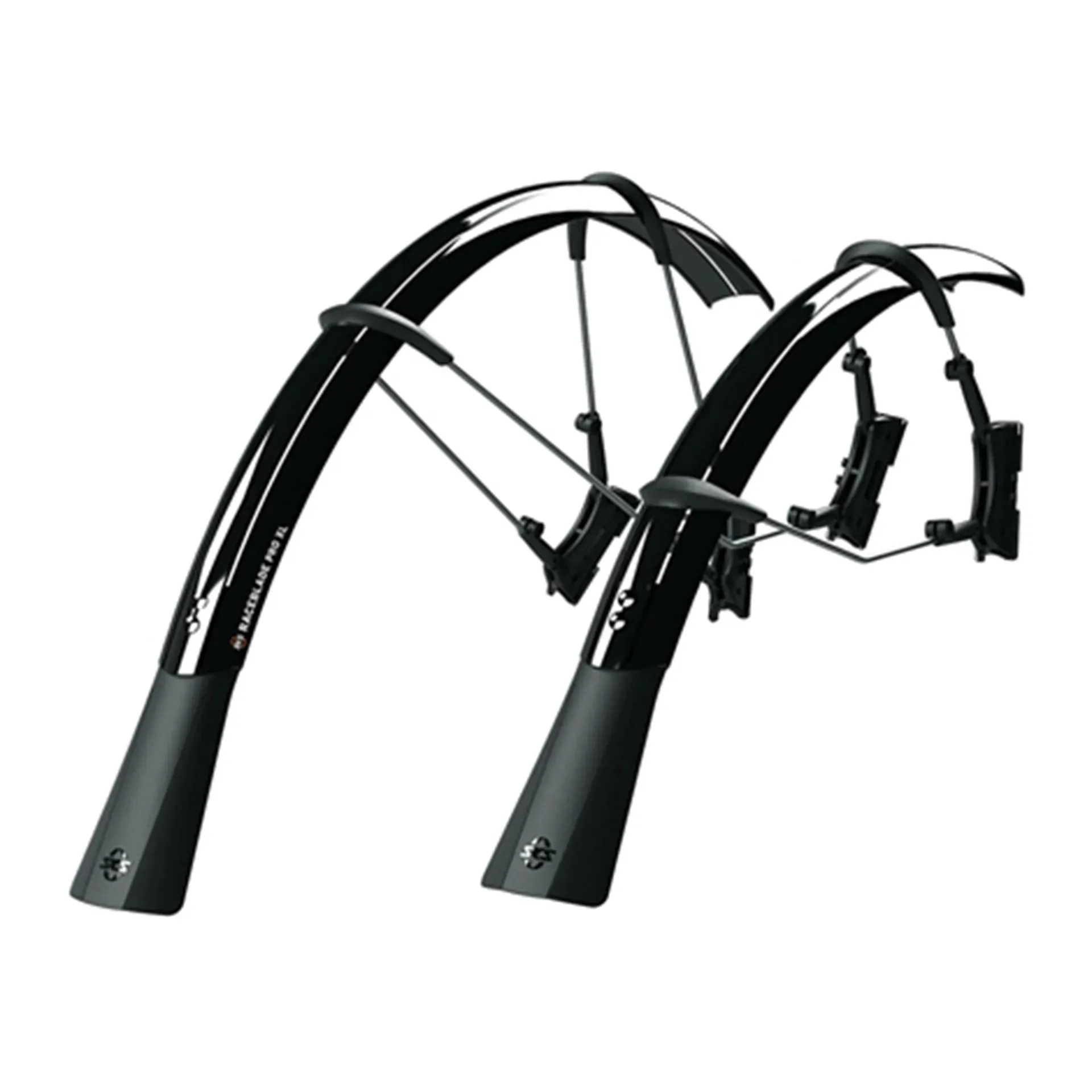 The ultimate clip-on mudguard set for road bikes. Raceblade set for max. tyre width up to 25mm, Raceblade XL up to 32mm. The smart, double hinged quick release fitting system also fits aero forks and is compatible with disc brakes. Mudguards can be perfectly adapted to the radius of the wheel by adjusting the length of the stays. Superlight extra long mud flaps give additional spray protection. Includes adhesive protection kit to avoid damaging the paintwork.