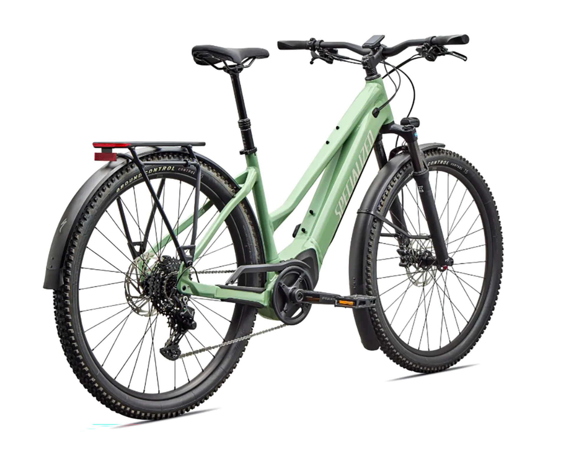 E5 Aluminum, mid-drive motor, fully integrated & lockable downtube battery, internal cable routing, wheel lock mount, and front rack compatible