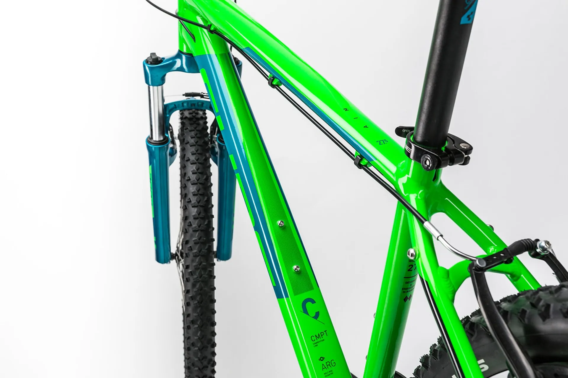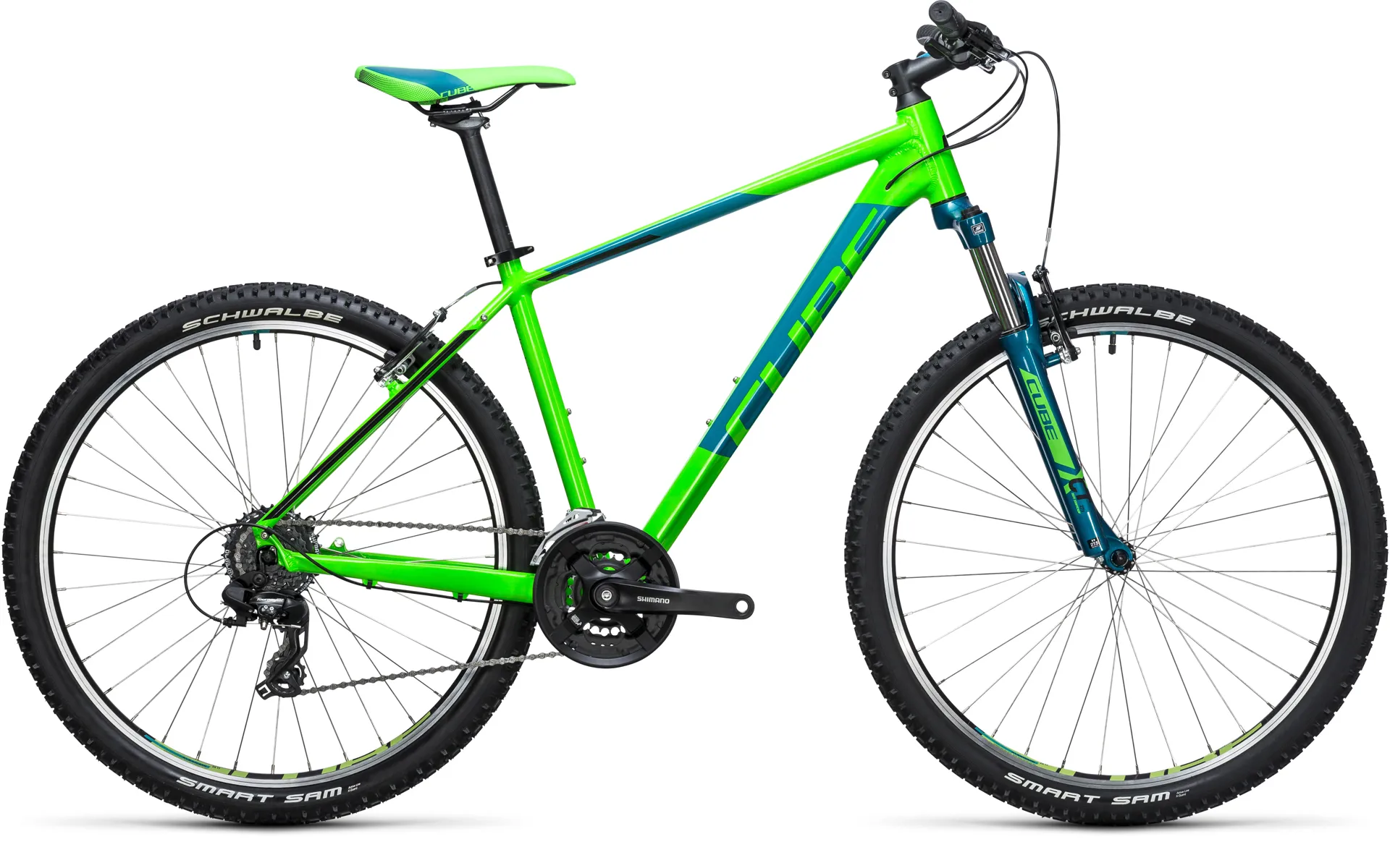 Fat-tyred adventures start here. The Aim is our dependable aluminium hardtail, boasting a comfortable ride position and durable transmission. It's the ideal starting point for your first adventures off-road. The cross-ovalised down tube is made from 6061 aluminium using our Advanced Mechanical Forming process, creating a a very strong but light backbone. Multilayer wet paint brings out the best in the simple but bold black 'n' white colour scheem. It also helps shrug off everyday knocks and scrapes, ensuring your frame will keep its good looks. Compact Agile Ride geometry gives the Aim a perfect blend of lively handling and a relaxed, comfortable ride position. The Suntour XCT suspension fork is a real highlight, improving ride comfort and safety with 100mm of coil spring travel. Schwalbe Smart Sam tyres combine low rolling resistance with plenty of off-road grip, while Shimano's 3x8 transmission components provide reliable gear selection. V-brakes are light and easy to use, bringing the Aim to a halt quickly and safely. CUBE cockpit components and an MTB-specific saddle combine easy control with the ergonomic design and comfort needed for longer rides.
