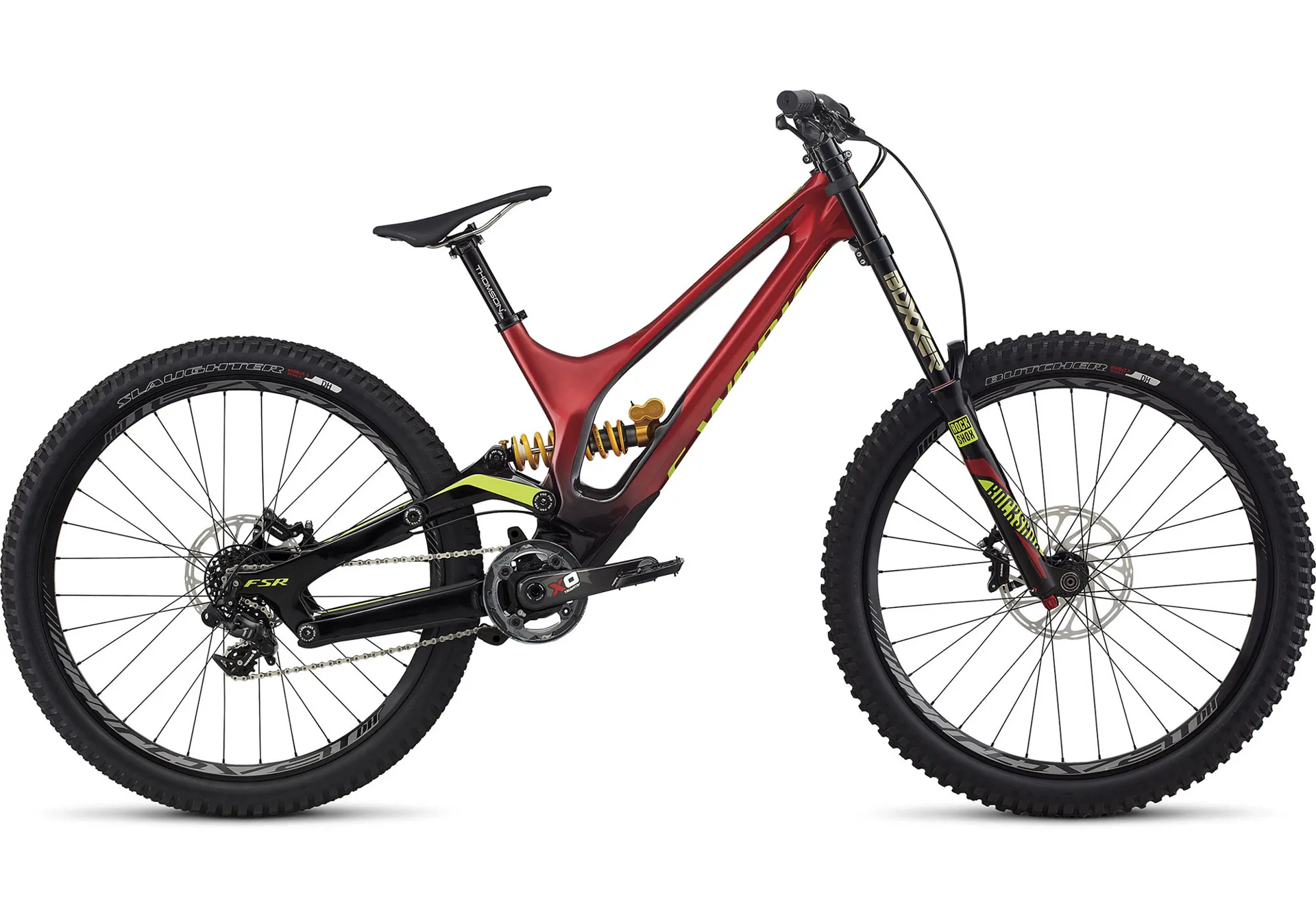 Relentless, fast, aggressive - no matter how you describe it, downhill racing is demanding. Starting with the bike, you're inserting control into a borderline uncontrollable situation wherever you can. When it comes to harnessing gravity's pull, while also maintaining confident handling, it doesn't get any better than the S-Work Demo 8. It's constructed from our finest carbon fibre, FACT 11m, for unparalleled stiffness and strength. At the front, you'll find 200mm of travel coming through a custom-tuned RockShox BoXXer Team 650b fork, and at the rear, you get 200mm of travel via a game changing Öhlins rear shock. The build is also dialed-in, sparing absolutely no expense in providing the utmost in lightweight, durable performance. This means that you get powerful SRAM Guide RS brakes that control Code calipers and 200/180mm Centerline rotors, a precise one-by X01 DH seven-speed drivetrain, strong & stiff Roval 650b wheels, and Butcher & Slaughter DH tyres for the ultimate in traction and control. Add it all up, and you get everything you need to send it down the mountain with more speed than you ever thought possible.
