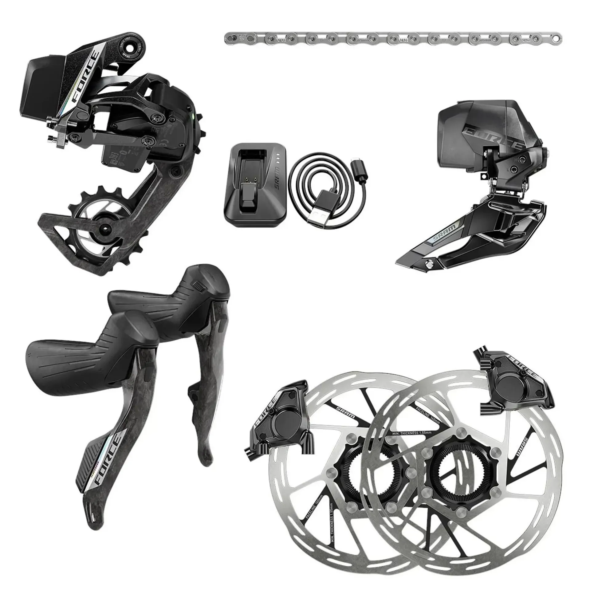 This complete aftermarket road bike groupset includes everything you need to upgrade: wireless shift-brake levers, a front and rear electronic derailleur, flat-mount hydraulic disc calipers, 12-speed chain, matching rotors, and an AXS battery charger.